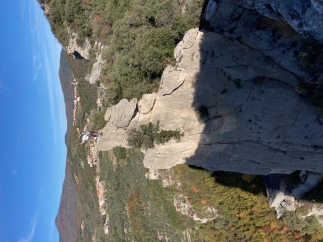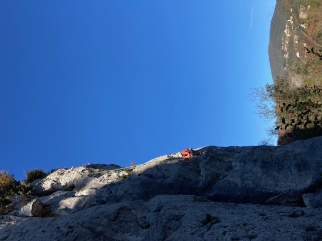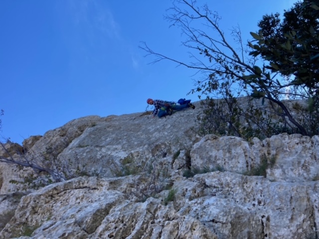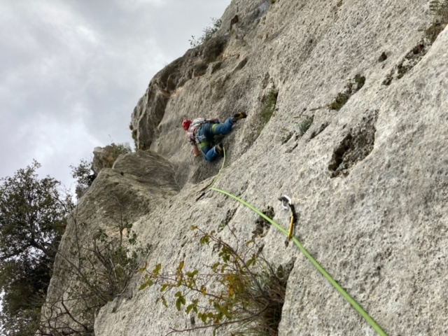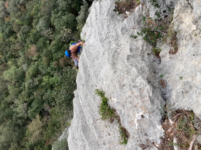 Tady jsme se taky hned po příjezdu a ubytování první den rozlezli. Najdete tady několik sektorů s desítkami lehkých cest v obtížnosti od 5a – 6a v ostrých dírách a hrubém vápenci. Jištění po 2 metrech, délka cest od 15-30 metrů. Bez minimálně 15 expresek se neobejdete (-: