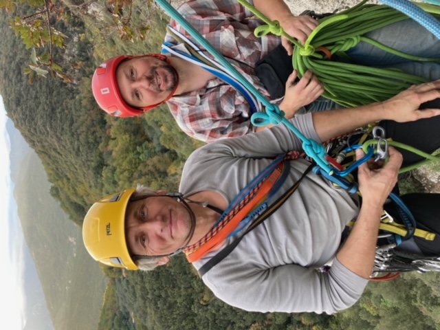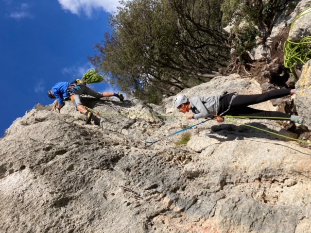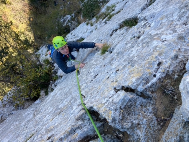 Na masívu Perti Nord se rozdělujeme do čtyř dvojic a lezeme různé 5-délkové cesty. Já si s Petrem užívám krásnou 5c+/6a s “poctivými” lezeckými délkami na pilíři, ve spárkách a sokolících a nakonec s 6a dolezem převisem na vrchol. K autu přicházíme za hluboké tmy.
