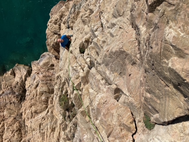 Středa. Jedeme lézt k moři na útesy do oblasti Capo Noli. Má být jasno, ale větrno. Cesty, do kterých naslaňujete ze zábradlí ke štandu 2-3 metry nad hladinou moře, stáhnete lano (vždy jej smáčíte aspoň trochu v moři) a lezete cestu, kterou musíte vylézt, protože jste si lano stáhli. S Petrem jsme vylezli čtyři krásné cesty 5a-6a. Předpověď nelhala a když vítr zesílil tak, že už nebylo slyšet spolulezce a museli jsme si volat mobilem, aby ten druhý zrušil jištění, nebo když lano při slanění vlálo vodorovně, tak jsme to nakonec v 15 hodin zabalili a odjeli jsme ještě něco vylézt do oblasti Boragni.